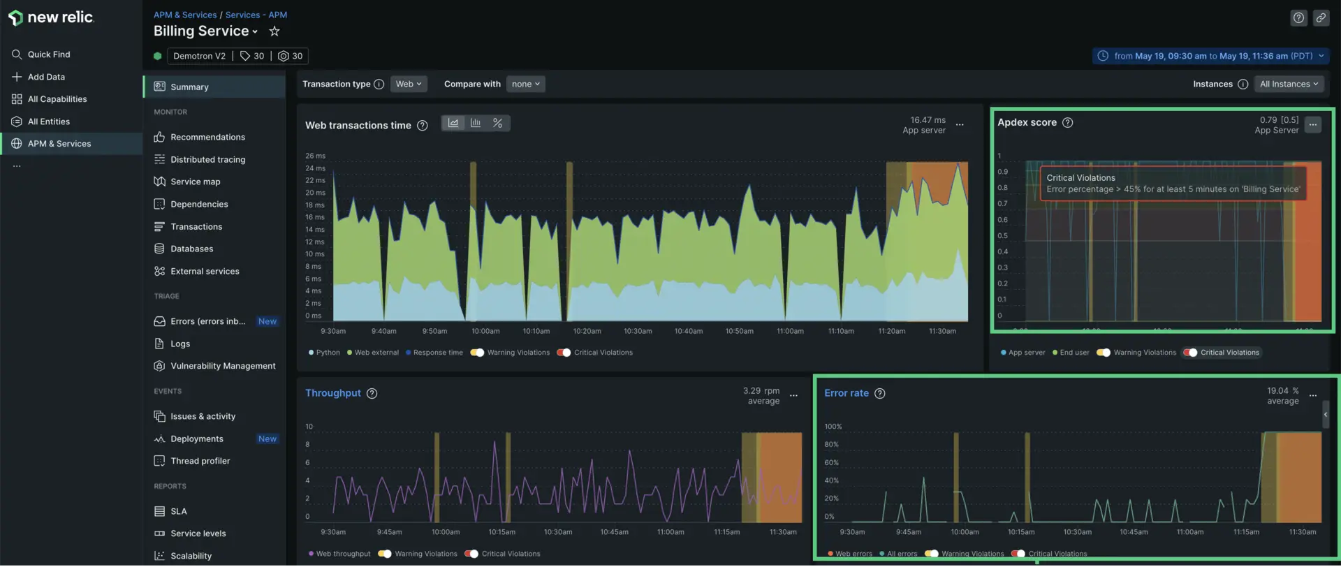 Billing Serviceen APM y abrir la página Summary para obtener una descripción general del estado de su sistema. Una puntuación alta de Apdex, que es una medida de satisfacción del usuario, puede indicar que hay un problema en su sistema. Aquí puedes ver que la puntuación es .79. y ha desencadenado un incidente crítico.A continuación vas a comprobar tu tasa de errores. Aquí puedes ver que la tasa de errores ha llegado al 100%.
