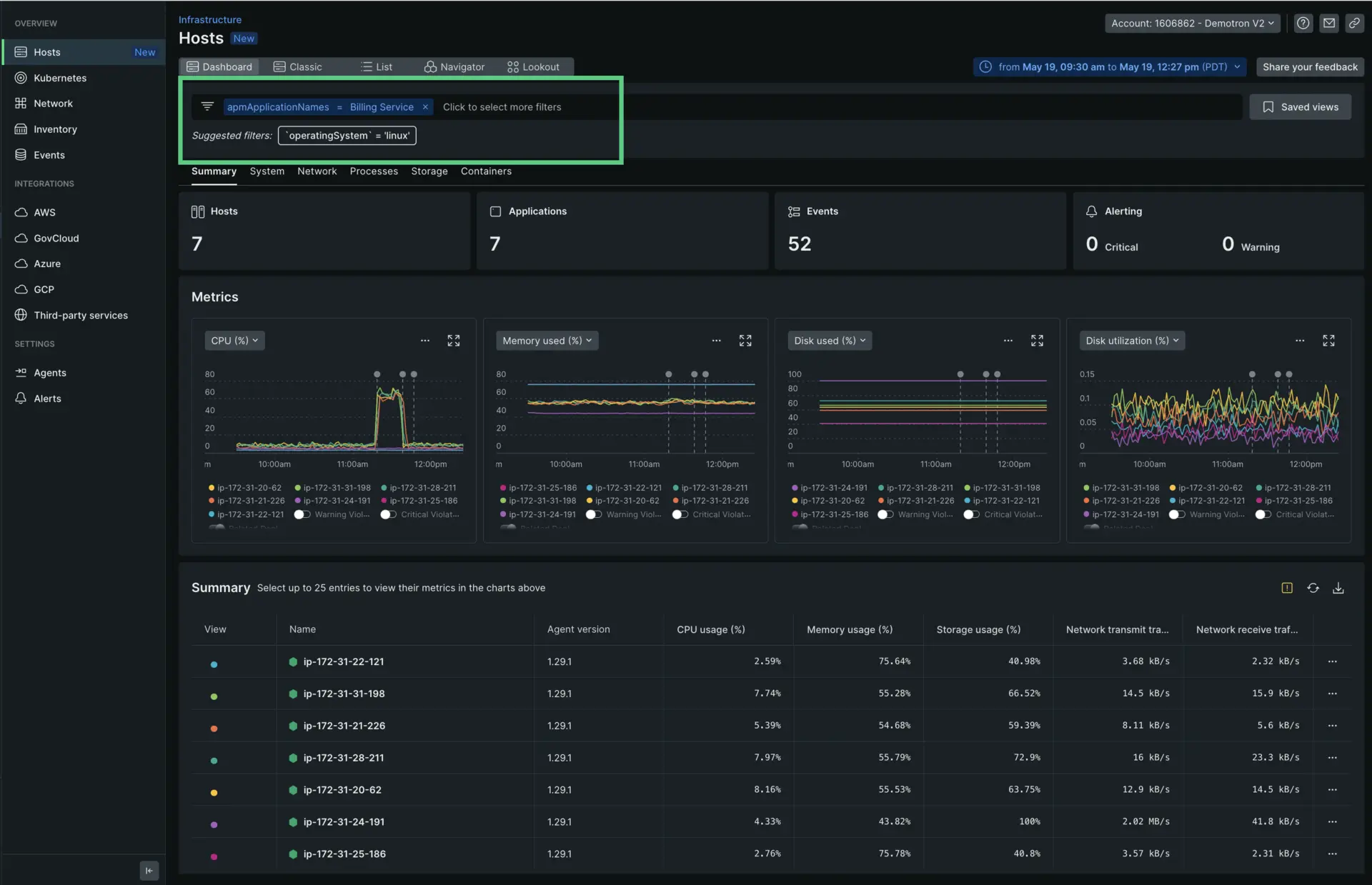 Cuando sus datos y de infraestructura están vinculados, puede filtrar los datos del host mostrados buscando la aplicación específica que desea inspeccionar. En el caso anterior, querrás filtrar por Billing Service.