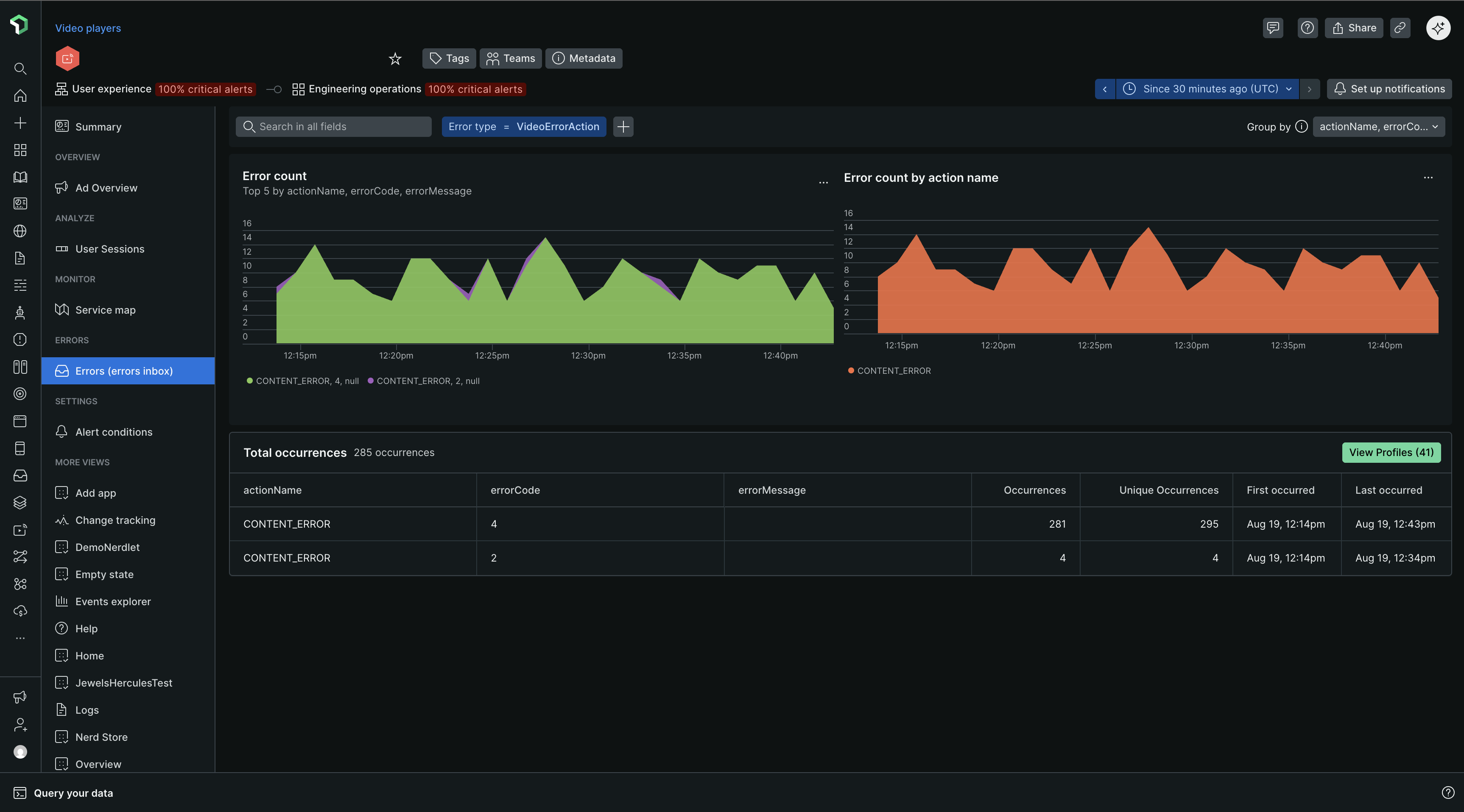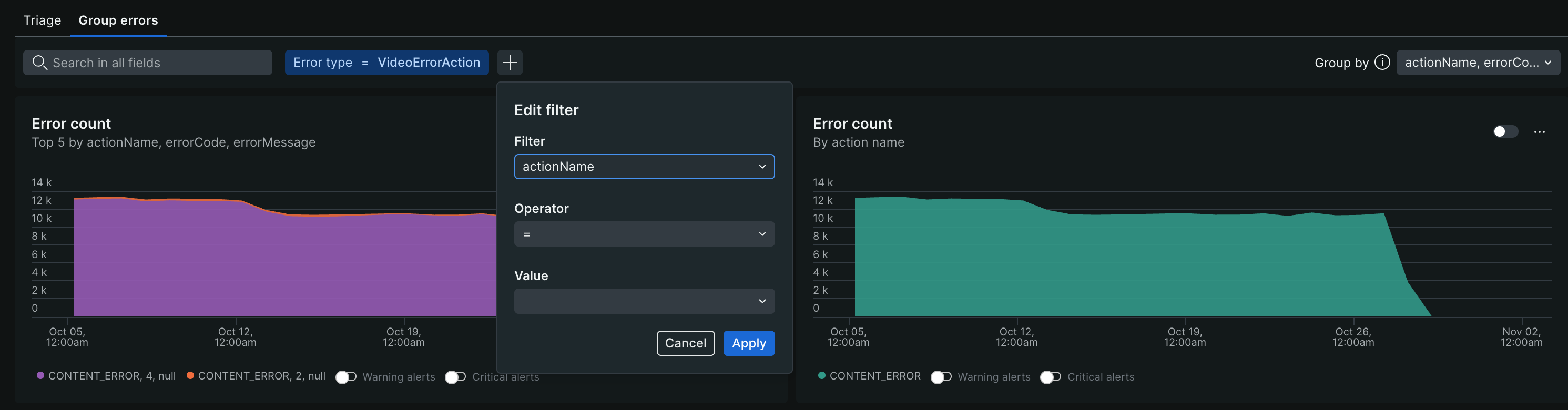 The Group errors tab offers detailed information about error rates, count, and types of errors occurring within streaming video and ads. This enables you to pinpoint trouble spots and determine which issues to address first.